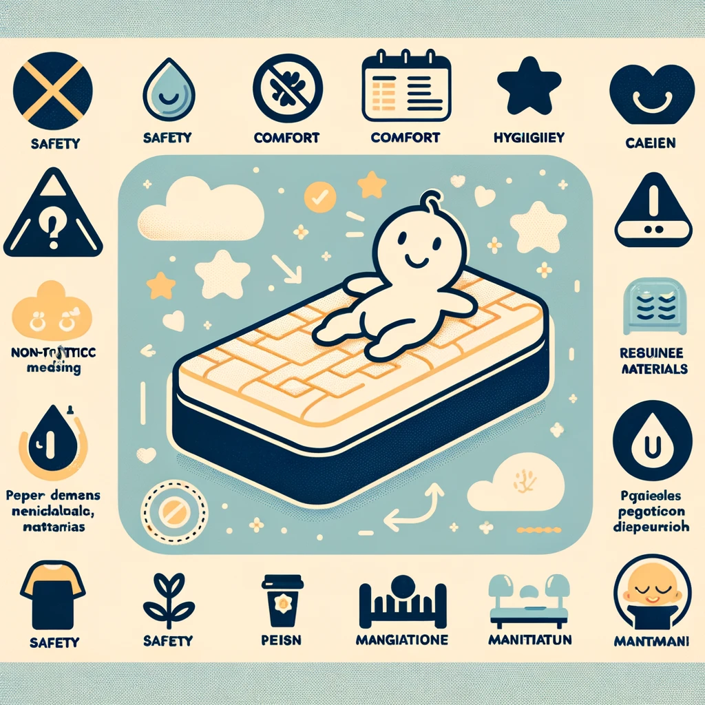 아기 매트리스는 안전성이 가장 중요합니다. 소프트하지만 지나치게 부드럽지 않아야 하며, 아기가 숨을 쉬기 어려울 정도로 매트리스에 파묻히지 않도록 해야 합니다. 또한, 불에 잘 타지 않는 소재를 사용하는 것이 중요합니다.